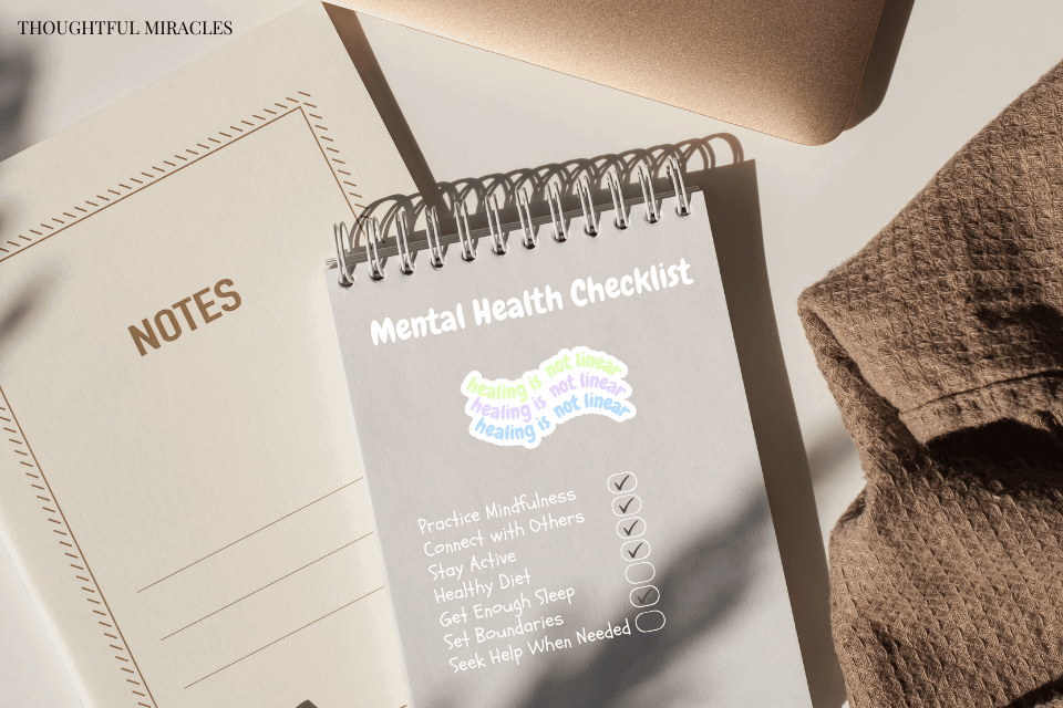 1. Quote: "Healing is not linear" is written in a soft, rounded font that enhances the comforting message.