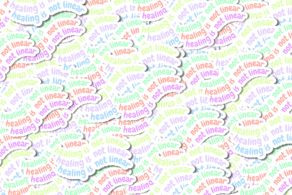This "Healing is Not Linear" sticker is designed to provide a gentle reminder of the journey of healing. Available as a free download, this sticker features a soothing design with pastel colors that evoke a sense of calm and reassurance. The text "healing is not linear" is repeated three times in a wavy, flowing pattern, emphasizing the message that healing is a process with ups and downs.