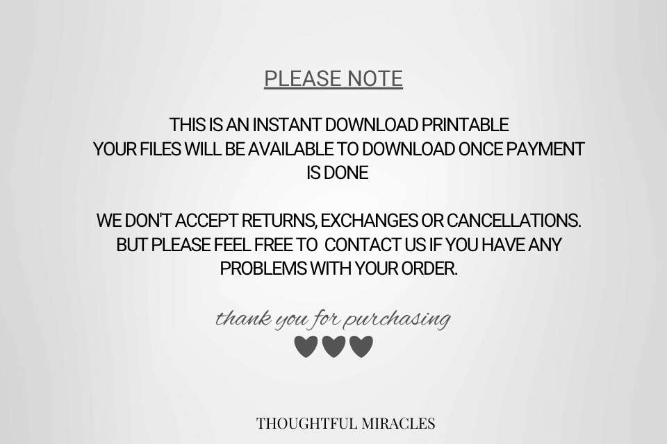 This listing is for personal use only. By downloading this listing, you are agreeing to these terms and conditions. Thank you for choosing Thoughtful Miracles!
