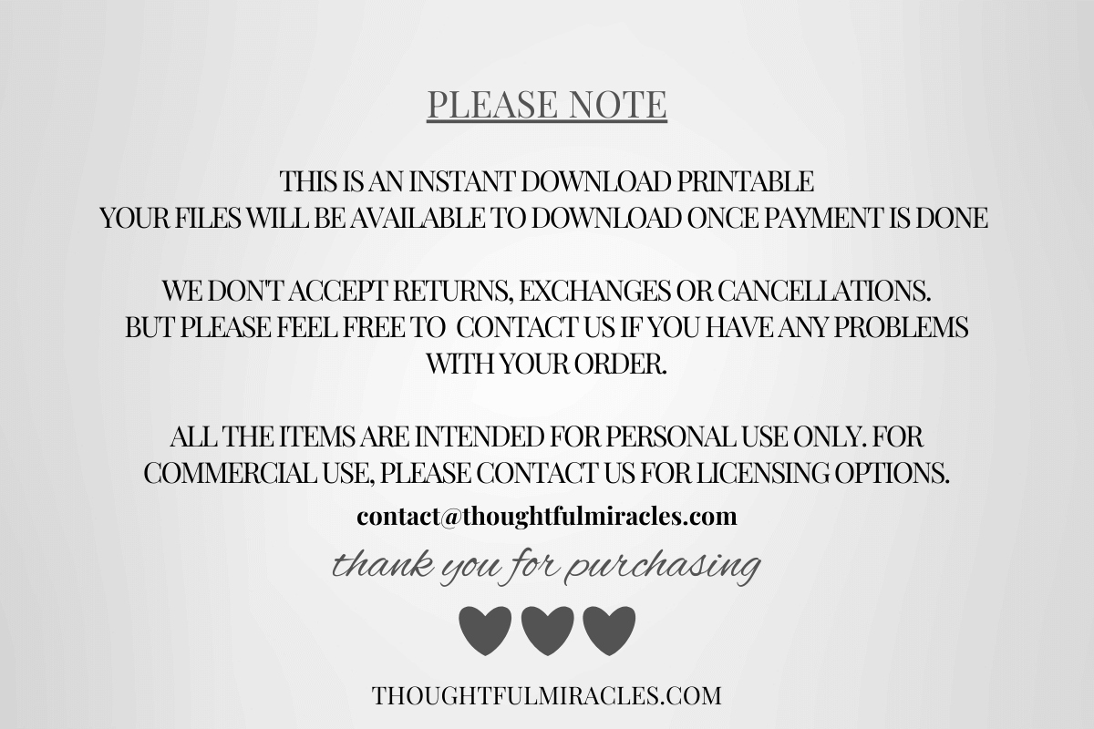 This listing is for personal use only. By downloading this listing, you are agreeing to these terms and conditions. Thank you for choosing Thoughtful Miracles!